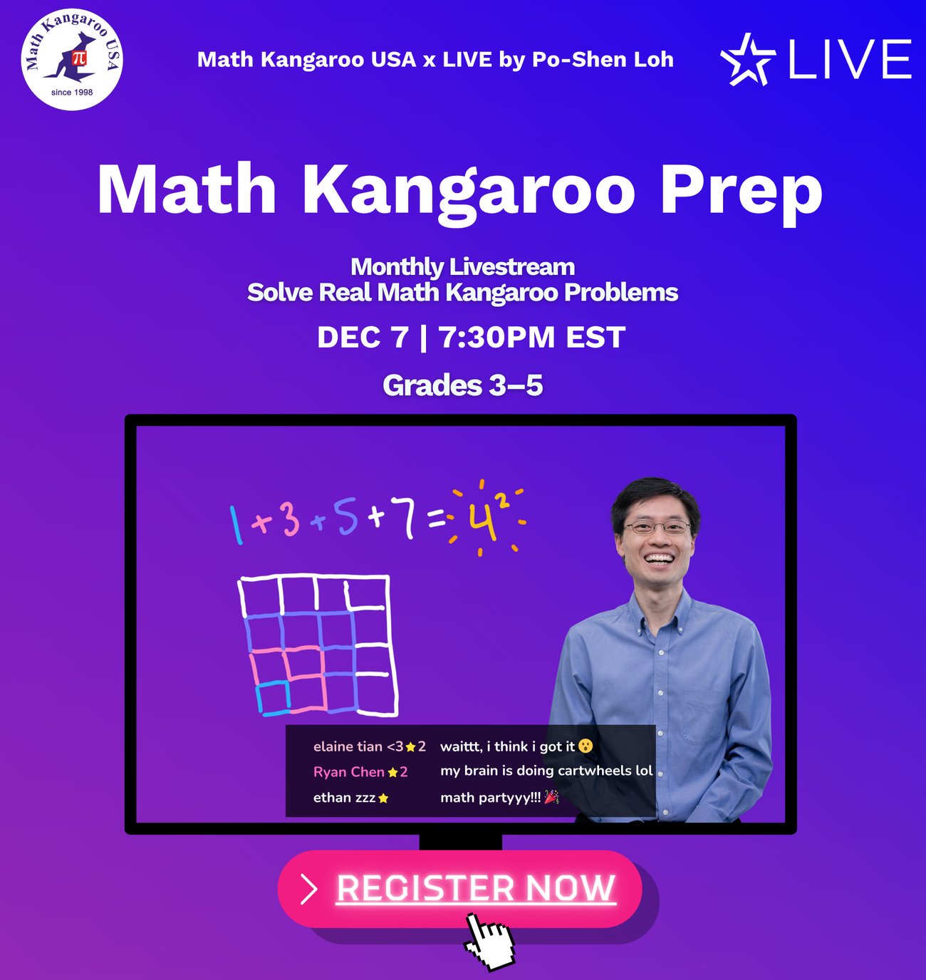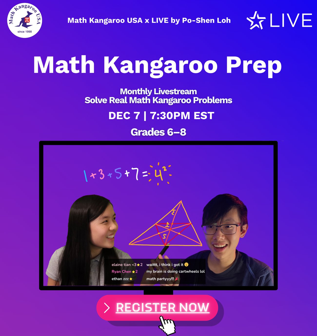On Dec 7, join our interactive LIVE Solve session, led by two national math champions. Students will tackle previous Math Kangaroo problems together through collaboration and brainstorming.